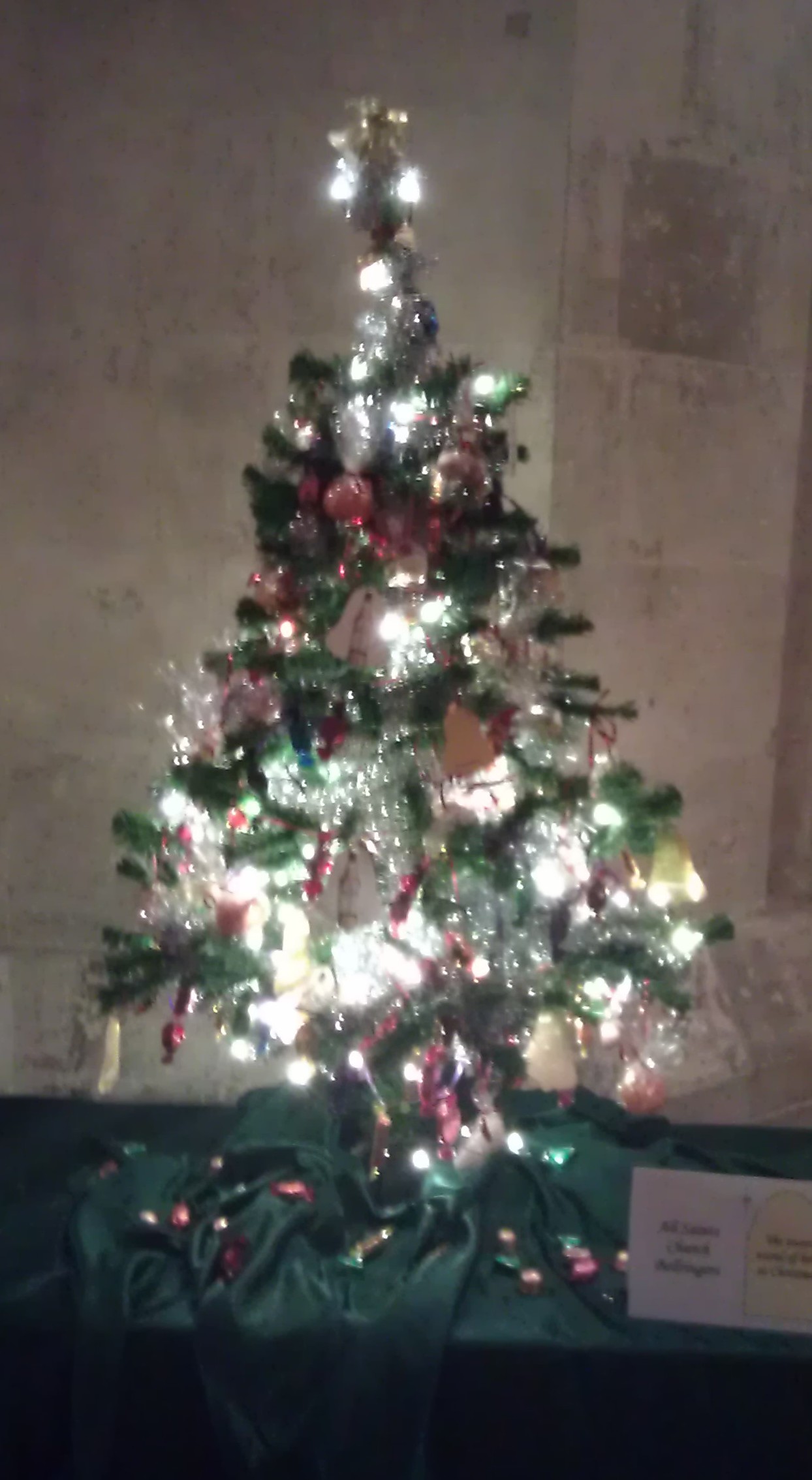 Our effort. Last night, we went to the church, armed with my mum’s old artificial tree, a bucket load of tinsel and as many Quality Street chocolates, stapled to ribbon as we could carry. (Oh, there are chocolate mice and oranges too).
